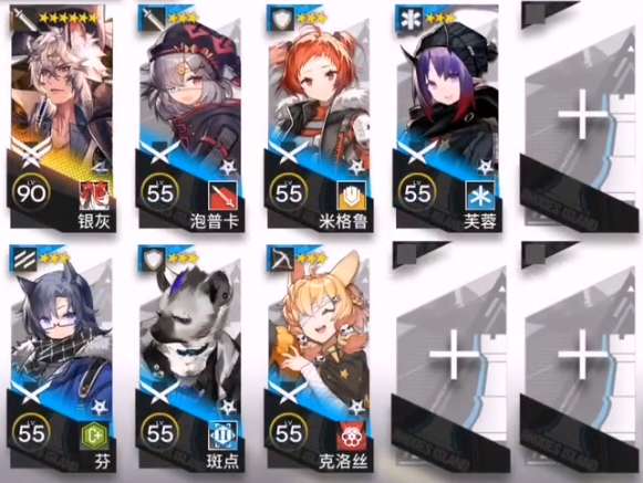 需求干员:泡普卡(群攻近卫)、芬(挡2先锋)、斑点(奶盾)、米格鲁(重装)、芙蓉(单奶)、克洛丝(单狙)