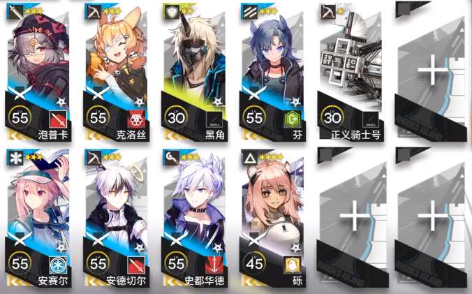 需求干员:泡普卡(挡2以上近卫)、克洛丝(单狙)、安德切尔(单狙)、安赛尔(单奶)、史都华德(单法)、芬(挡2先锋)
