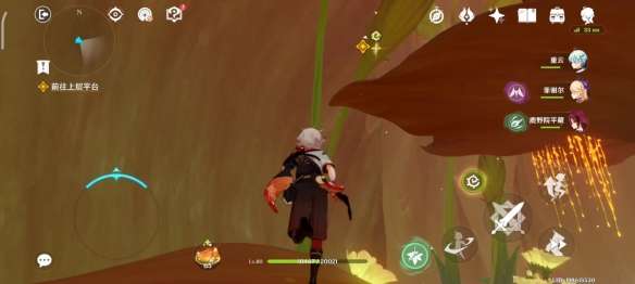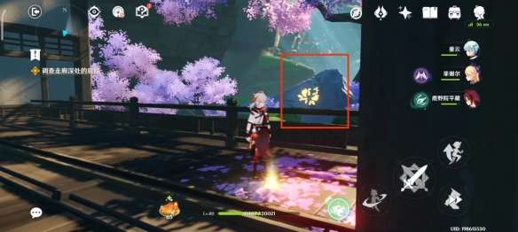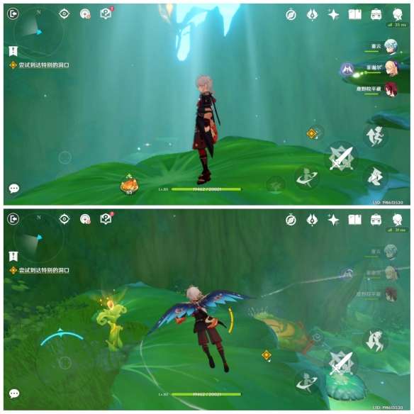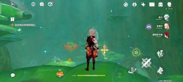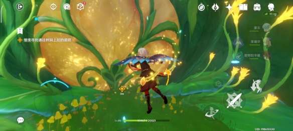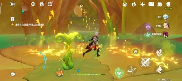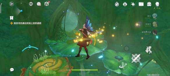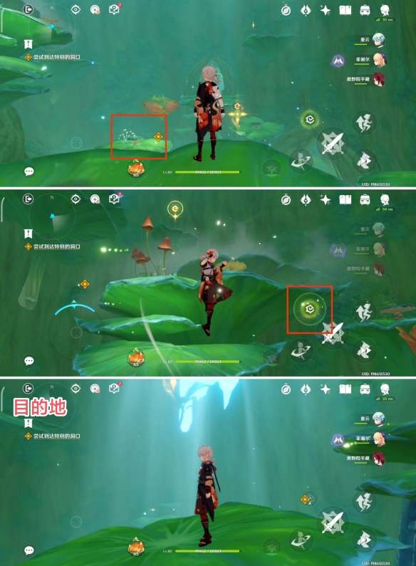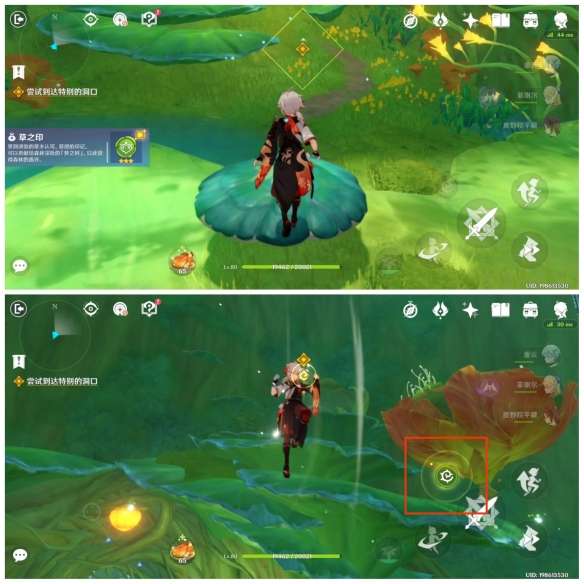 2、根据任务提示来到蘑菇旁边,利用蘑菇起跳。当红框内图标亮起时候点击,利用上方的四叶印快速到达。