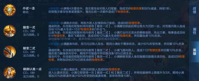 遇弱则进:在技能后短暂时间内使用【随变一式】,小满腾空跃起后劈出势大力沉的一击,对范围内敌人造成目标10%最大生命+1037物理伤害和1秒击飞。