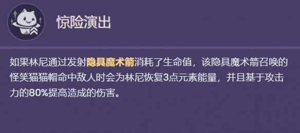 如果林尼通过发射隐具魔术箭消耗了生命值,该隐具魔术箭召唤的怪笑猫猫帽命中敌人时会为林尼恢复3点元素能量,并且基于攻击力的80%提高造成的伤害。