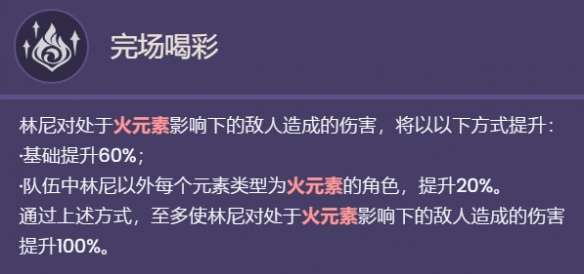 队伍中林尼以外每个元素类型为火元素的角色,提升20%。