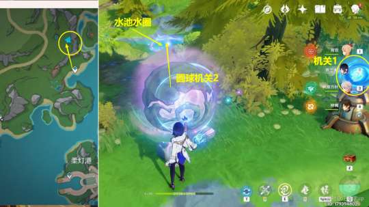 1.你需要来到游戏中的特定位置,与机关1进行交互并获取其特殊能力。接着,长按E键使用该能力,将圆球机关2对准下方的水池水圈,再发射圆球。成功将圆球射入水圈中,则顺利完成解密。如未成功,可多次尝试直至成功。