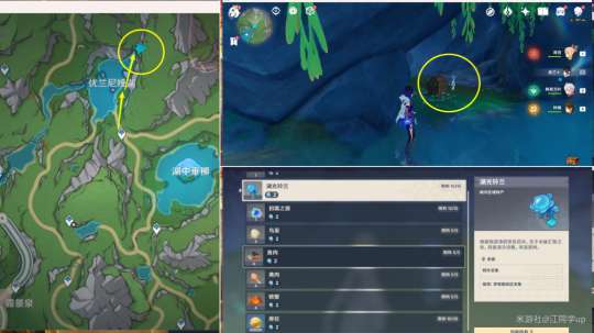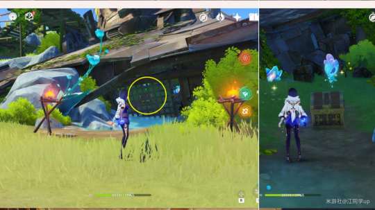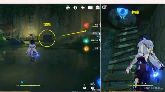 3.当我们进入上图所示的水下传送漩涡后,就会来到下图所示的地下位置。在那里,我们可以打开一个箱子并获得第3个【幽灵枝】。同时,我们可以从右边进入该位置,在楼梯的上方寻找一个神瞳。我们可以顺便拿走它。