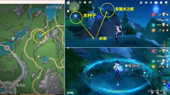 1.请到图片所示的位置,拾取【水种子】,然后进入下方的水池中等待一段时间,【水种子】就会变成大水圈——【水之核】。接着将水之核放入设备中即可。