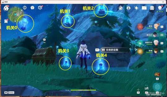 2.首先,您需要攻击左边的机关0,这样右侧的4个机关就会开始上下旋转。当机关1和机关2旋转到和上面的水圈平行位置时,您需要再次攻击左边的机关0,这样右侧的4个机关就会停止旋转。此时,机关1和机关2位于上面的水圈内,而机关3和机关4位于下面的水圈内,这样就可以同时激活这4个机关。一旦激活完这4个机关,您就能完成解密,然后得到1个珍贵宝箱。打开宝箱,您将会获得第二个【幽灵枝】。