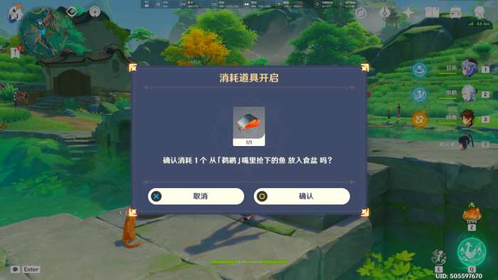 阅读完石碑上的内容后,根据派蒙的提示,我们来到石碑右侧的小土坡上,在此处往河里投喂生肉(没有生肉也不要紧,旁边贴心的放了好多)
