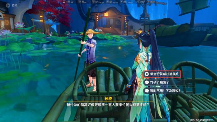 在此处我们与竹筏上的孙桡对话,选择“乘坐竹筏前往翘英庄”