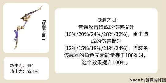 破魔比较适合重击角色,其在普通攻击方面和弓藏拉武器相比具有很大的优势。在甘雨、林尼和提纳里等角色中,破魔是他们攻击期望值最高的选择,尤其是在没有五星弓和大月卡弓时。