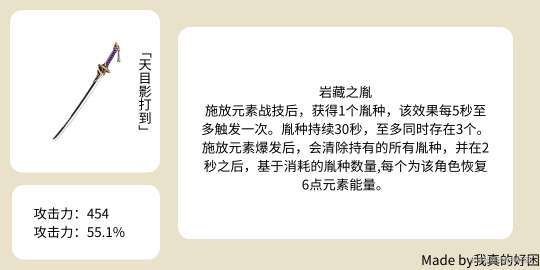 首先是神里绫华,天目提供了高额的攻击力加成,很适合绫华,满精的天目除了攻击力加成外,每次开大还可以给绫华提供24点能量,让绫华的循环更加的舒服。(现在首推海渊)