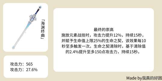 首先,我们要分析海渊绫华这把武器。很多博主以及我自己之前并不看好它,认为它不太特别。但是实际测试结果表明,海渊绫华表现得非常出色。实际上,海渊绫华达到了很高的攻击力上限,比天目多了400多攻击力。天目需要副词条提供54%攻击力加成才能和海渊绫华的攻击力相差不远。如果充能达到130-150,海渊绫华可以循环使用。如果队伍中有辅助带西风或者一命申鹤,海渊绫华的充能时间可以更短一些。这样,海渊绫华的攻击加成会比天目高27%左右。因此,现在更推荐使用海渊绫华。老玩家可以先用天目,毕竟单手剑武器比较难获得。