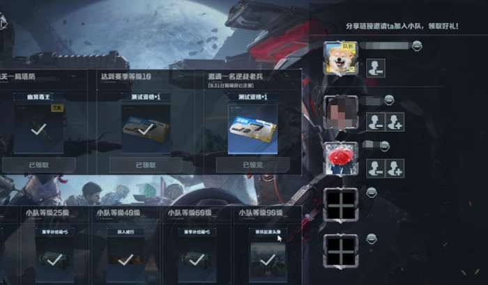 当然在特殊老友的招募活动当中,玩家也可以在招募面板内,邀请并未注册游戏的玩家,随后和他一同组队,当小队等级升级到二十五级、四十级、六十级、九十级时,分别能够领取到游戏内的资源奖励,最高级时,即可获取皮肤奖励。