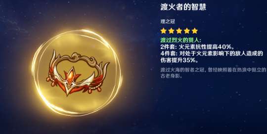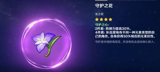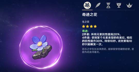 如果有人认真看了这个四星圣遗物的效果,应该会感到很惊讶。它提供的最高单一元素50%的抗性,基本上无条件全程触发。这是一个非常有用的效果,可以让怪物的伤害减少一半。可惜这个圣遗物只有四星,基础数值太低。因此,即使是前期也没有人带它。而后期,四星圣遗物提供的数值不如五星全防御生命生存。