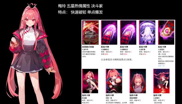 梅玲,很多玩家将其戏称为简单无脑暴力粉毛妹,其在配队要求方面是非常简单的,但整体可以打出非常强的伤害值,能够快速的破韧敌方打出高额的伤害量,角色的核心被动是“余烬”,怪物处于余烬状态怪物受到攻击或者击破时,按照持有余烬数量使伤害量增加30%。发动效果时移除一层于禁,最多可叠加5层,能够不停的给怪物挂debuff。卡牌方面是两个攻击、一个护盾,起始能力卡牌是攻击卡牌伤害增加40%。