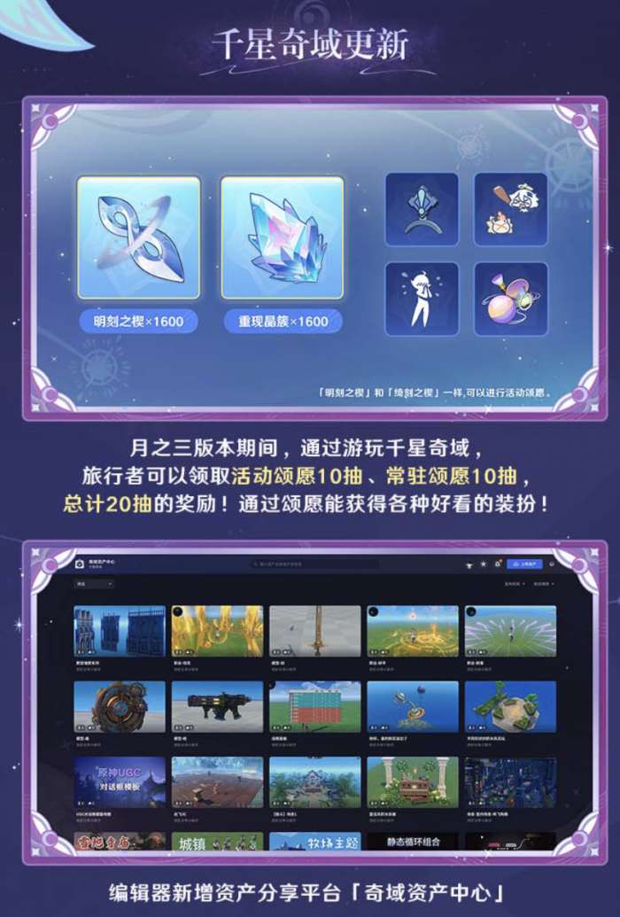 6.2奇域更新后,月之三版本期间,通过游玩千星奇域旅行者可以领取活动颂愿10抽、常驻颂愿10抽,总计20抽的奖励!通过颂愿也能获得各种好看的装扮。