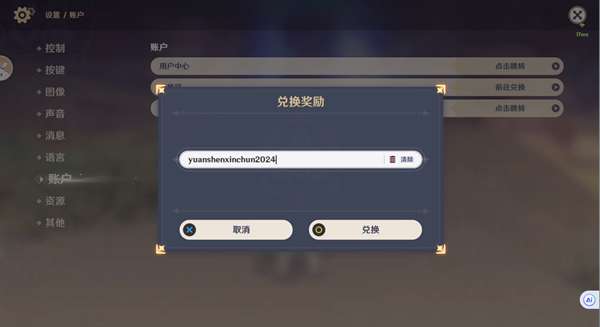 4.输入yuanshenxinchun2024和yuanshen兑换(需要在1月24号后开启)