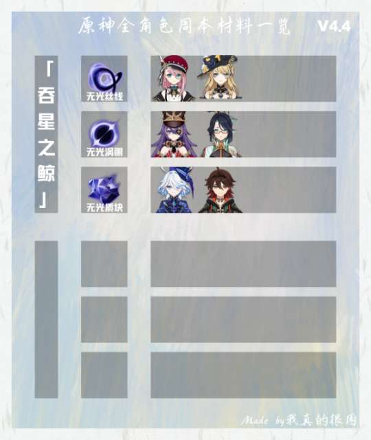 软件提交 专题合集 热门手游在原神中,周本材料是非常重要的资源之一,因为一个周本的角色天赋突破材料一共有3种,每次刷出来的都是随机的,短期内去刷不一定能刷到大家想要的材料,所以大家如果有想抽的角色,可以速查该角色所需的周本材料,提前准备起来,以防需要的时候不够用。在本文中,我们将为大家带来全角色周本材料一图流,帮助大家更加轻松地完成周本任务,提升角色实力。无论是新手还是老玩家,都可以从本攻略中获得许多有益的信息,赶快和我们一起来看看吧!
