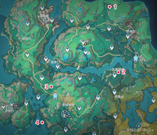四处古茶壶解谜位置如下图所示,后面会按照序号标注顺序逐个进行详细介绍。(图中标注点位为解谜开始的起点)