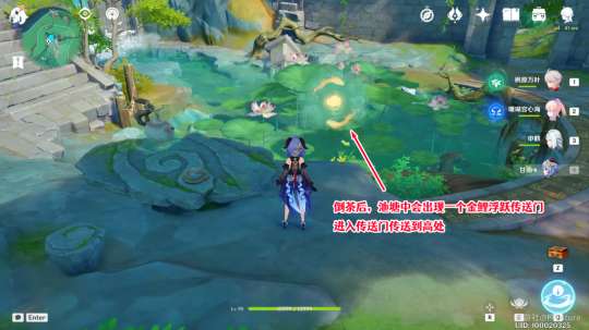 倒茶后,旁边的池塘中间会出现一个「金鲤浮跃」传送门,我们激活传送门进行传送。