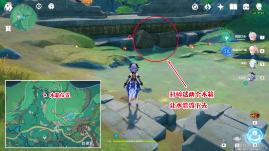 到下图所示位置高处,把这两个木箱打碎,让水流可以从木箱后面的缺口流下去。