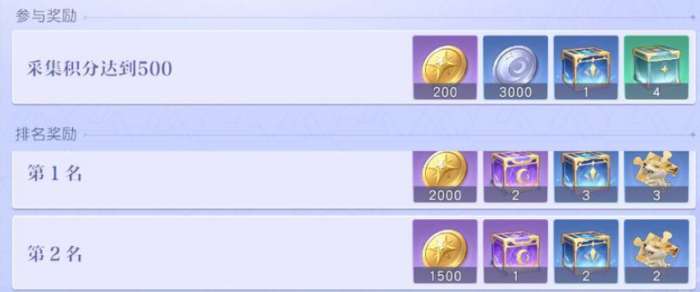 而在玩法当中大家可以建议开启竞赛之后再集中再去进行采集,这样的话还可以达到活动参与奖励,当前参与此类竞赛效果里面会分为个人版以及团队参与版,不同的参与版本对于当前大家的状态是有要求的,如果大家是在组队的过程当中看到这个竞赛的话,可以参与的是小队版本的竞赛,而当前是个人在采集的话,可以参与的是个人的竞赛版本,而在规定时间之内采集的数量最多的队伍或者是玩家,在这里可以获取到奖励说明是根据当前的排名进行奖励发放,每天给到的奖励都是一样的,但是在其中这个奖励是非常有用的,其中有非常多的采集材料,所以不喜欢慢慢的收集,大家就可以参与这个活动,其中的各类采集材料通过活动直接一次性通过宝箱送给大家,所以这个竞赛每天一次的开放时间大家还是可以摸索出来,让自己获取到更多的采集资源的。