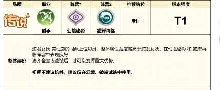 从强度定位来看,该角色处于当前版本T1梯队(第二梯队),核心定位为后排远程物理输出单位。其机制支持在“幻影秘境”与“彼岸再临”两大阵营间自由切换,具备典型的流水型射手特征——持续输出稳定、技能衔接流畅、环境适应性强。相较同阵营多面手型角色如蛇发女妖,万蛇之母在单点压制力、技能倍率成长及模型辨识度方面均具明显优势。