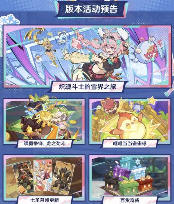 12月19日【炽魂斗士的雪界之旅】大活动也会开启,完成后可得1120原石+新四星活动弓箭武器,12月29日【飒勇争锋·龙之劲斗】活动开启,依旧是420原石奖励。