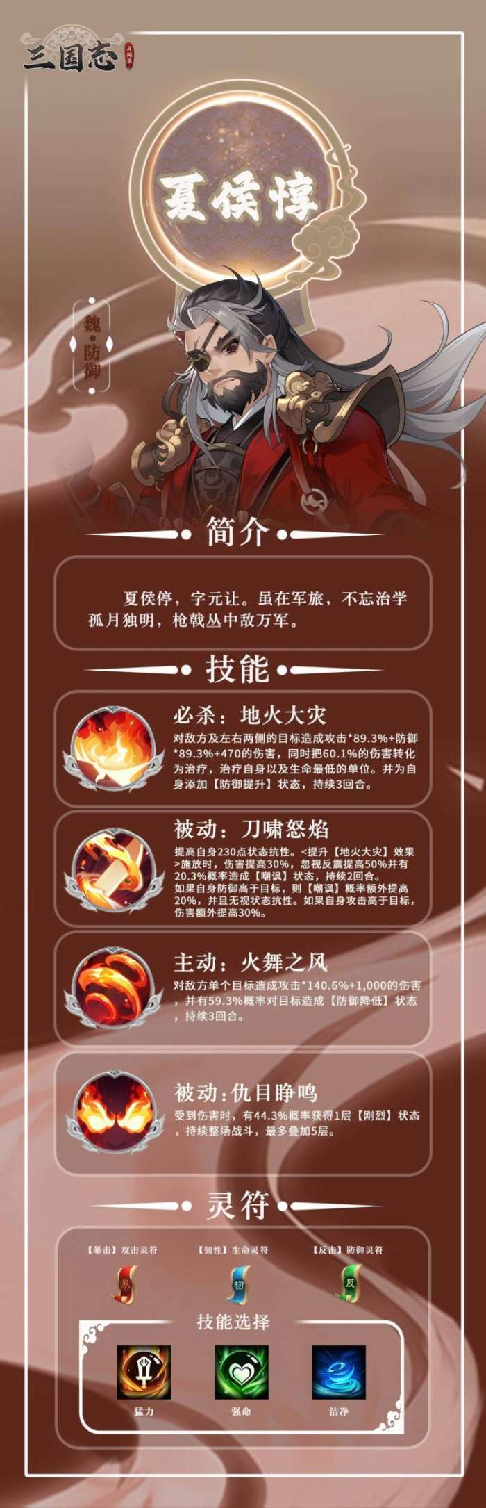 【定位】夏侯惇是又能进行输出,又为队友承担伤害的防御型武将。普通技能进行点杀,必杀能造成伤害并进行治疗。