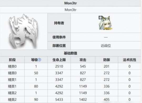 Mon3tr不止是面板高,在其他维度方面也极强。它的阻挡数是重装水准的三人,部署费用却和六星快速复活系干员一致,仅需10费。再部署时间也只有25s,略高于快活系干员。虽然Mon3tr占据了部署上限,但是它面板高、部署便宜、再部署快,各方面的综合实力实在是太可怕了。