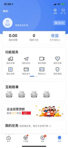 在下方我们可以看到四个不同的分类,分别是首页、卡友圈、消息和我的。然后我们点击我的进去。