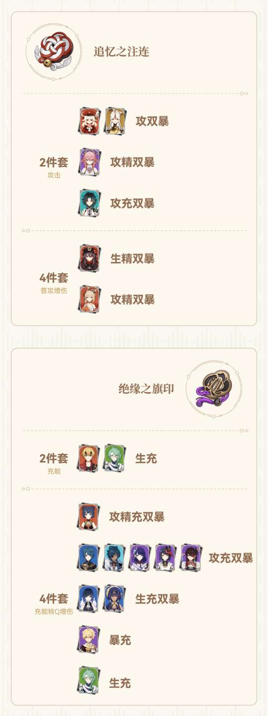 本次《圣遗物留弃指南》增添了千织的圣遗物选择,增加了新角色千织的圣遗物配装,希望在清理背包圣遗物、查找圣遗物主词条或套装适用上能够一如既往地帮助到各位玩家。