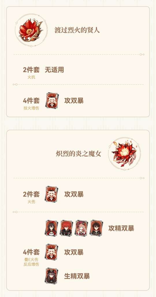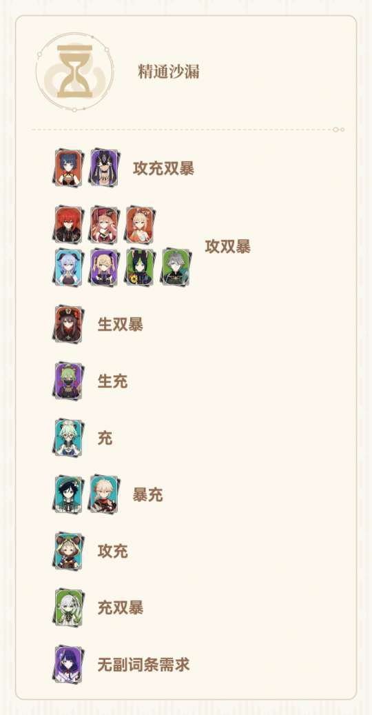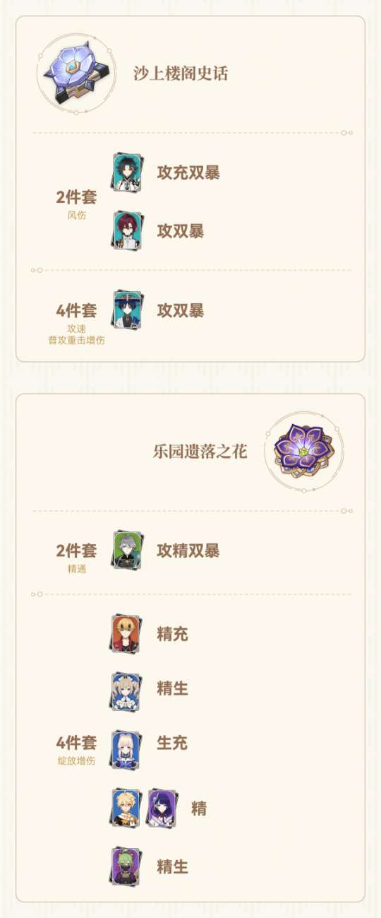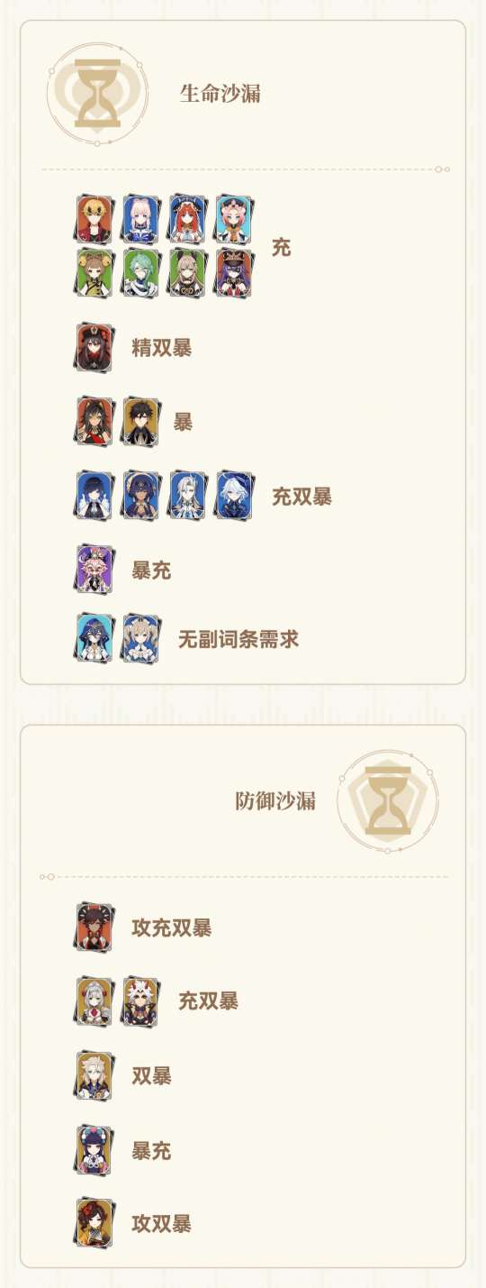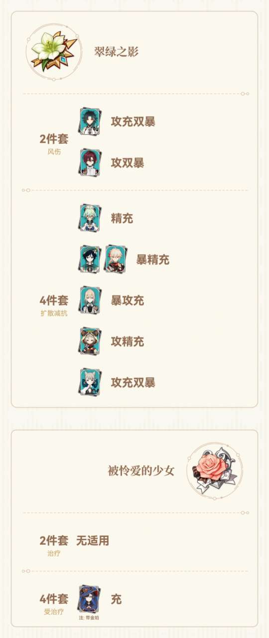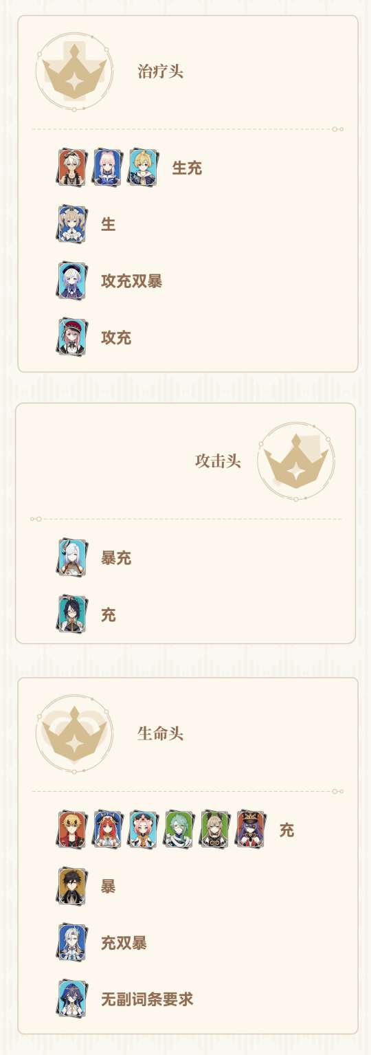 注:双暴头,属性伤害杯,攻击沙是一个输出角色的通用配装,不再详细列出适用角色。特别注意暴击头还可能给辅助角色用来触发西风武器。