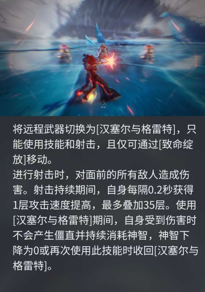 大招双枪,射程提升50米,获得霸体进行扫射,期间化身固定炮台不能移动,多远的怪都能打,攻速持续提升,清屏效果极佳。