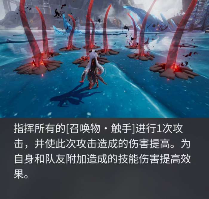 大招先召唤触手,主要是卡敌人位置和抓杂,每个触手可以串起2个进行硬控,输出并不高,但是控制力度很强,小技能也能控制触手攻击,并提供全队增伤。