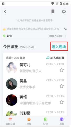 软件提交 专题合集 热门手游听果音乐app怎么看现场,打开听果音乐app,点击现场板块,可以看到会有各种各样的演出,点击进入现场,或者订购位置去店里,随后就可以查看本场阵容和什么时候开始。