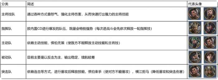 目前五类流派当中,其实如果大家不想要使用同一阵营的话,也可以选择混搭,因为部分的武将在其中,其实适合的场景是多种流派里面都可以放进去的,所以一个队伍当中某一个角色可能是有多重身份的,其中大家使用队伍的时候会发现其中流派也是有相互克制能力,比如说主动队跟突击队之间带来的都是相互克制的一个机制,这样的能力效果就看后期大家怎么带兵法,其中全部阵容效果。