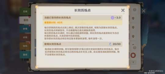 所以,作为此次版本历练点更新最大最主要的内容。我们可以简而言之的用一句话概括,如果你存在长效历练点,每一点历练点,可以在大世界花费任意30体力激活为今天的历练奖励也就是1个委托,长效历练点充足的情况下,一天花费120体力即可完成委托。(目前版本一天可以回180体力,储存上限200体力)