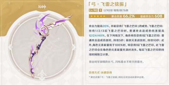 “飞雷之弦振”是一款5星弓,但其内卷程度严重,因此不建议专门抽取。虽然这款武器质量还算不错,但由于抽取价值不高,其价值不断下降。如果碰巧抽到了,而且对薙刀有需求的玩家可以考虑使用。