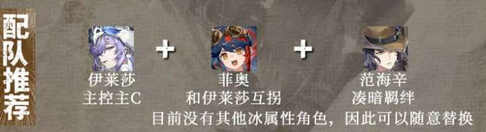 然后在消耗这些灵能时候,大家就可以使用技能3带来远程持续类的输出,最,如果使用蓄力普攻类型输出的话,还可以维持自己的灵能保持不动,当然其中也可以穿插使用一些技能3的效果,保证补足的伤害不低,这里为伊莱莎进行搭配队伍的话,还可以给她搭配一些具有辅助效果的角色,伊莱莎主要作为队伍里面的控制和核心输出角色使用,菲奥的话,因为也是一个同标签类型的角色,就可以跟伊莱莎一起达到增益激活的效果,而且她跟伊莱莎一起搭配的话,也是主要走的冰流派。