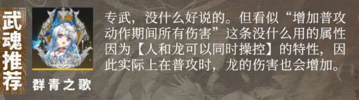 为这个角色搭配武魂的话,是比较推荐群星之歌的,群星之歌在游戏中相当于是伊莱莎的专用武魂,在能力上面可以增加普攻的伤害,而且只要是使用普攻动作的话,期间所有的伤害数值都是有提升属性的,而且这个属性是不管人形态还是龙形态同时都可以操控的,这样的特性也可以让她变得更加灵活一些,实际上只有她在普攻的时候,大家就算是在龙形态里面,伤害数值增加的幅度也不小,如果使用伊莱莎这样的效果进行输出的话,手法上大家一定要注意,前期先多用技能1的效果,技能1和蓄力普攻的话,大家获取灵能数值累积就可以给她后期带来更强的伤害。