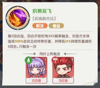 第2回合起,回合开始时有35%概率触发,对敌方全体造成500%总攻击的特殊伤害,并降低15%持续伤害减伤5回合。只触发一次