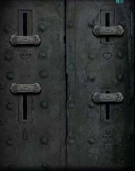 2、使用钳子打开笔记本,获得铁丝,根据桌面上蜡烛最高,第二是暂时空白,第三是苹果,第四是元宝的顺序,推动墙面上的四个机关,打开石门