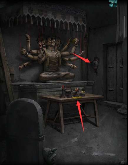 3、进入石门右边的棺材屋内,打败怪物,右边获得晾衣杆,推开中间的棺材板,看见六个奇怪的符号,使用晾衣杆按照顺序拉下招魂幡,佛像手上出现一个盒子,使用铁丝打开盒子,获得抽屉把手。