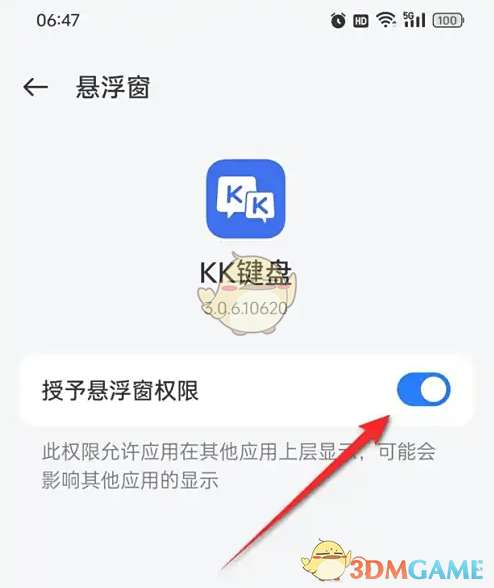5、将“授予悬浮窗权限”旁的小滑块点亮即可启用。