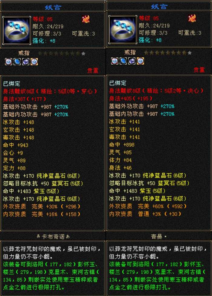 相比防具来说,戒指更加极品,都选择冰玄毒三属性140+深蓝大八星。