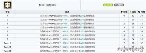 "命令:进行结构加固,提高自身和Mon3tr的防御力分别120%/130%/140%/150%,并且自身获得40%/50%的物理格挡能力。"