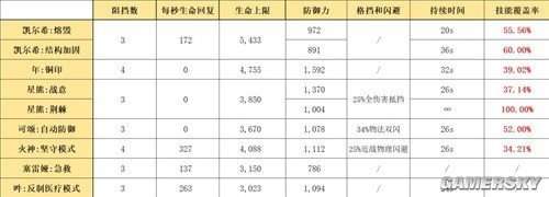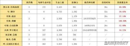 在阻挡能力方面,经过凯尔希加固的Mon3tr已经能够与重型干员相媲美。我们将对比年的“铜印”、星熊的“战意”和“荆棘”、可颂的“自动防御”以及火神的“坚守模式”。考虑到Mon3tr是在凯尔希的监管下运作,其也会接受到不断的治疗。因此,在最后的对比中,我们还考虑了塞雷娅和临光的“急救”、吽的“反制医疗模式”等奶盾干员的治疗能力。最终结果见上文。
