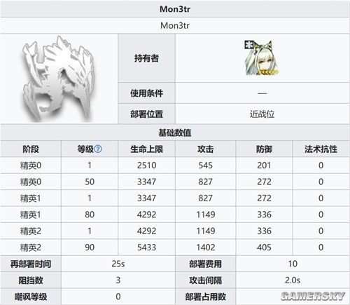 Mon3tr是一种治疗单位,可以使用并治疗自己和Mon3tr。它的再部署时间为25秒,但是仅当Mon3tr不在凯尔希攻击范围内时,它的防御力才会降至0。
