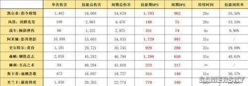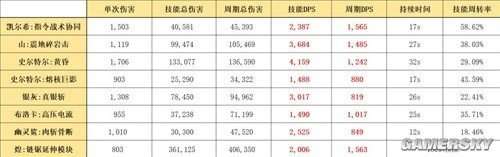 我们选择的比较对象是物理群攻技能,主要包括山的“震地碎岩击”、史尔特尔的“黄昏”和“熔核巨影”、银灰的“真银斩”、煌的“链锯延伸模块”、布洛卡的“高压电流”和幽灵鲨的“肉斩骨断”。比较结果如下所示: