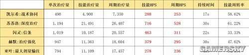 凯尔希的单体治疗能力不强,仅略胜过他的徒弟亚叶,比不上闪灵和赫默,而且只有深度治疗40%的治疗效果。相比之下,苏苏洛的治疗能力一直是无人能及的。虽然“指令:战术协同”赋予了凯尔希更高频的治疗,但实际治疗倍率没有增加,因此单次治疗效果很低,导致总治疗量也不高。在治疗领域中,凯尔希最核心的作用仍然是作为Mon3tr的辅助,让这个挡三打三的群卫怪物能更加自由地输出。